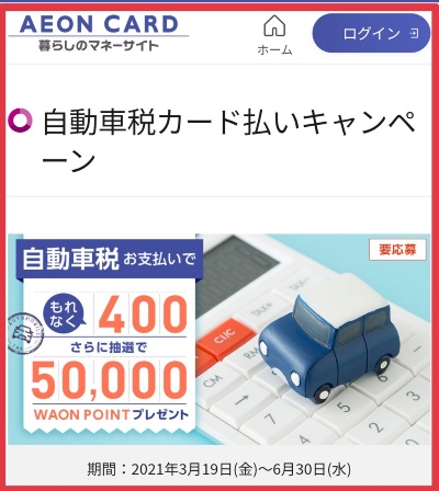 イオンカードで自動車税を支払うと、25,000円以上の支払い1件につき、400waonポイント付与!