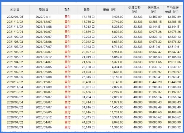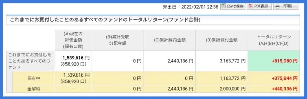 最初の積立投信を買付したのが、2020年3月頭なので、ちょうど1年11ヶ月ということになります。