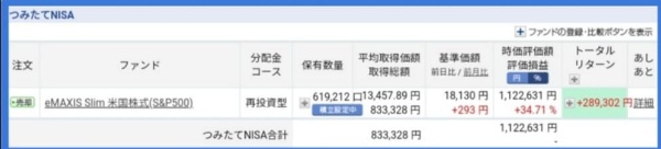 取得総額は833,328円で、時価評価額が1,122,631円。評価損益は+34.71%で、トータルリターンは+289,302円でした。