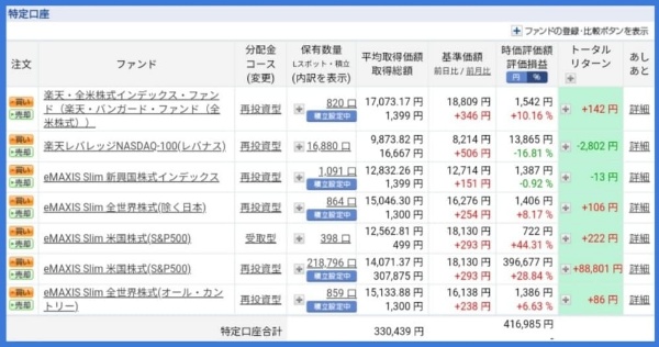 特定口座全体の取得総額330,439円で、時価評価額は416,985円。評価損益は+26.19%で、トータルリターンは+86,546円という結果になりました。
