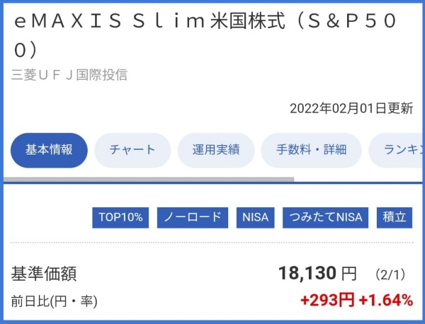 2022年1月5日のemaxis slim米国株式(S&P500)の単価(基準価額)は19,408円です。12月2日は17,749円でした。