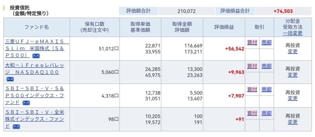その他、実験的にいくつかの投資信託を毎月100円位ずつ楽天証券の特定口座で購入しています。