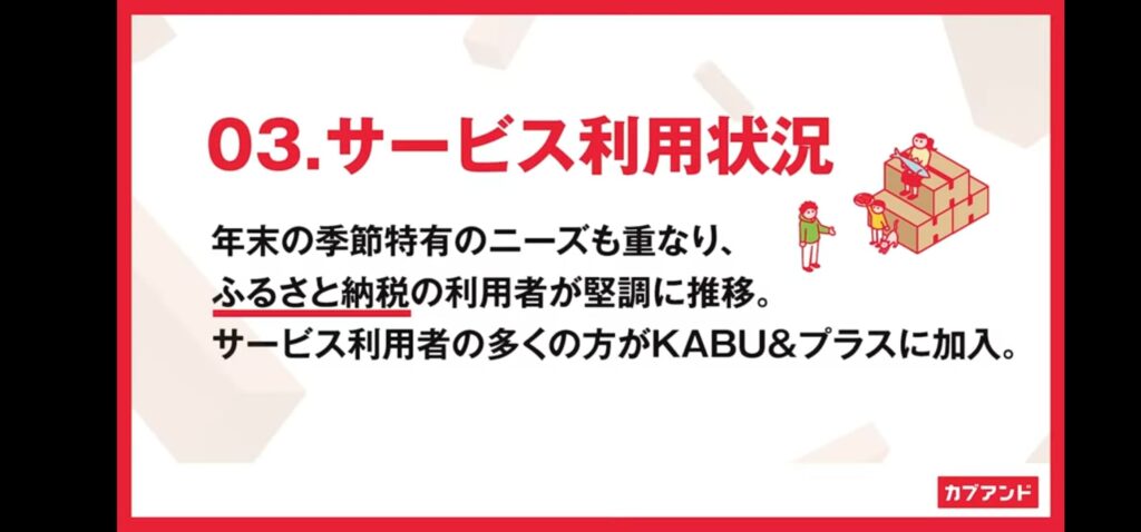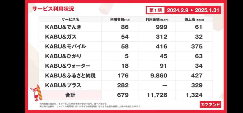 ただし、あくまで延べ人数です。KABU&プラスは、もらえる株引換券の還元率が2倍になるサブスクで、この利用者がなんと28万2,000人。KABU&プラスの利用者は間違いなく他のサービスも利用しているので、正味の利用者は40万人を下回っているはずです。