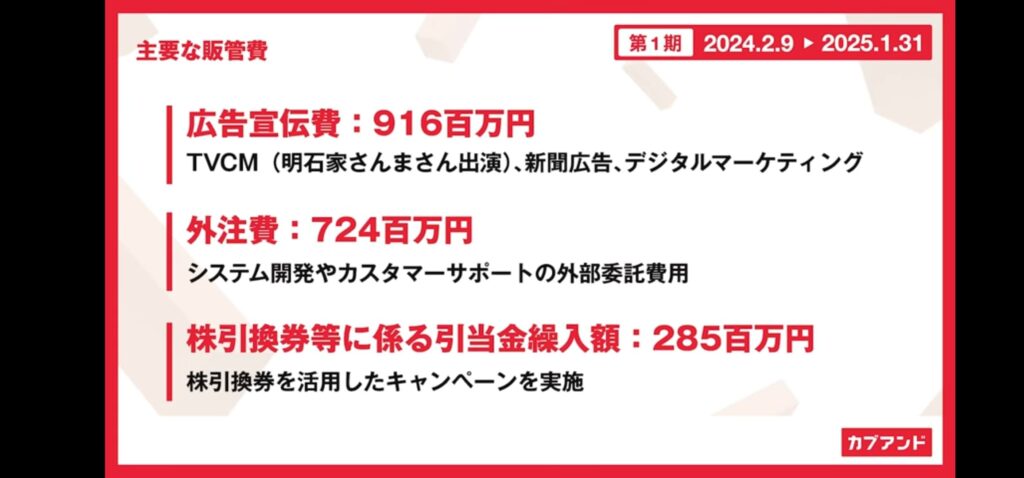 赤字の要因となった販管費。広告宣伝費が嵩んだようですね。明石家さんまさんを起用したテレビCMなどが主な要因とのことです。ギャラ、高そうですもんね。