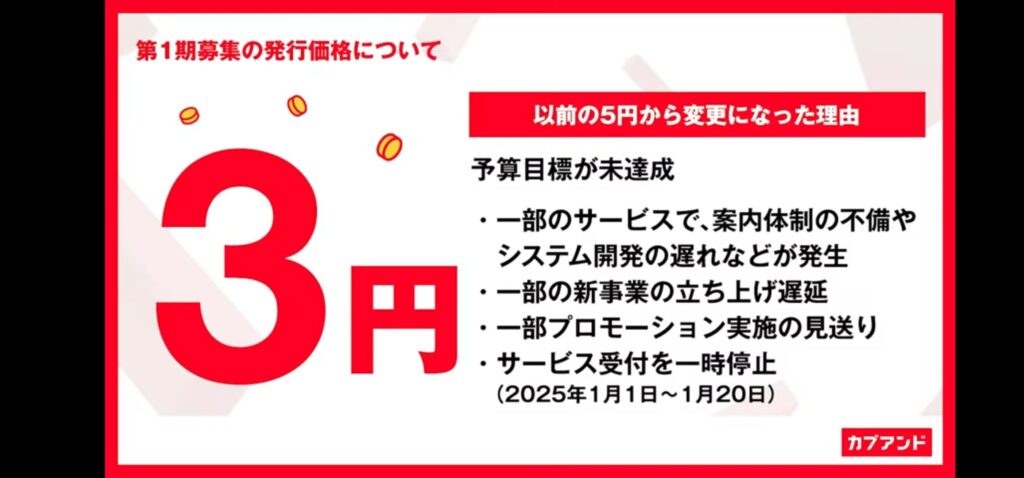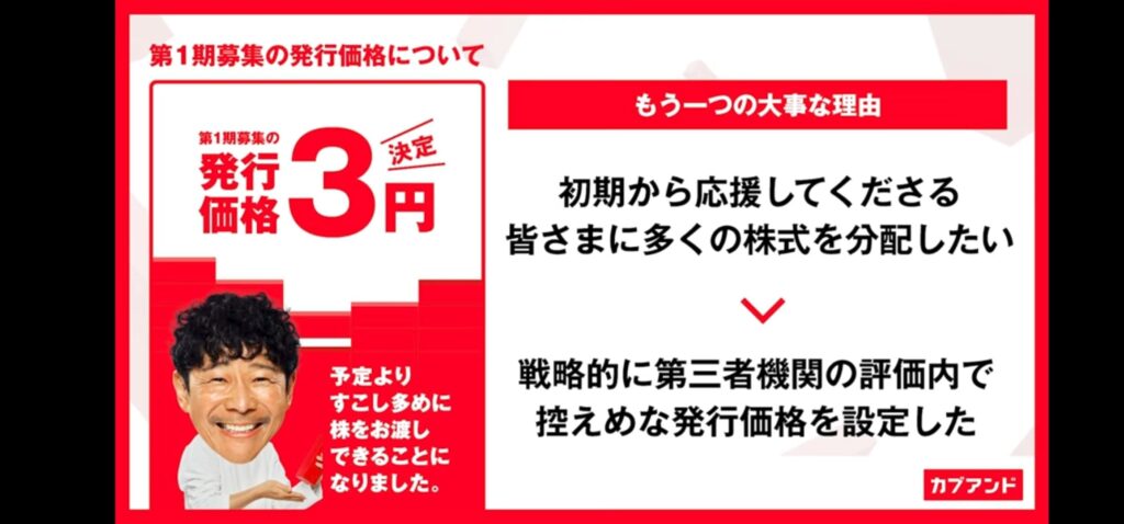 当初、5枚(円)と説明されていた発行価格は、3枚(円)となりました。
