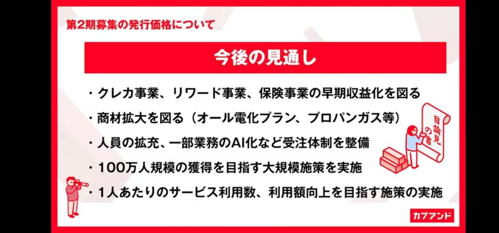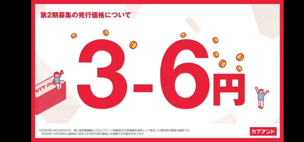 今後の事業の進展により、第二期募集の発行価格は、3〜6円のレンジ内ではありますが、5円になるかもしれません、5円になるように頑張ると言っていました。