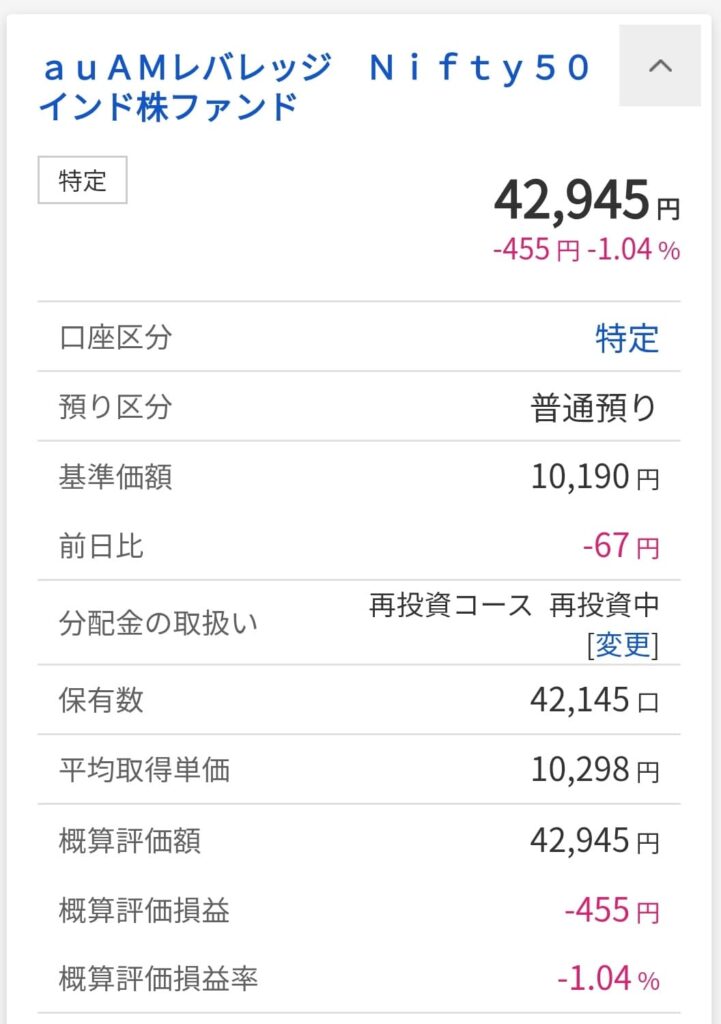 投資については、マネックス証券で「auAMレバレッジNASDAQ100」とNifty50(インド株)連動の「eMAXIS インド株インデックス」、2倍レバレッジの「auAMレバレッジnifty50インド株ファンド」を毎日200円ずつ、つみたて設定しています。毎日600円ですね。