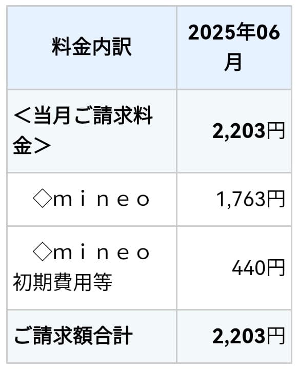 6月は音声通話もSMSも使用ませんでした。というわけで通信料金は、mineoの基本料金1,763円と初期費用440円で合計2,203円でした。