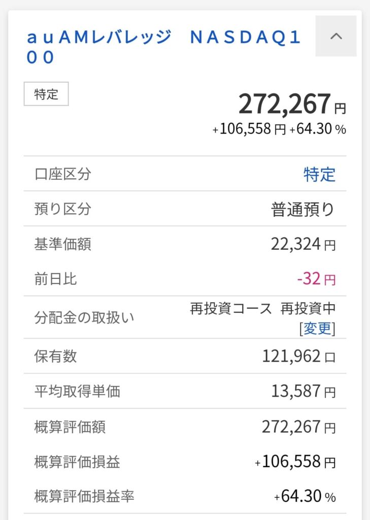 投資については、マネックス証券で「auAMレバレッジNASDAQ100」とNifty50(インド株)連動の「eMAXIS インド株インデックス」、2倍レバレッジの「auAMレバレッジnifty50インド株ファンド」を毎日200円ずつ、つみたて設定しています。毎日600円ですね。