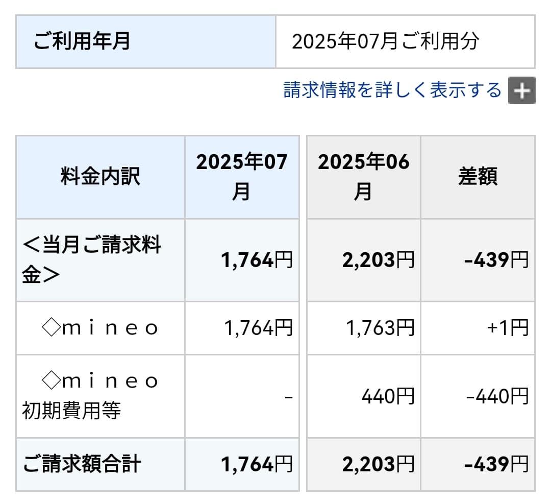 携帯は2025年6月1日からプランを変更しました。『mineo』は変わりません。データ専用プラン1GB880円(税込)にパケット放題プラス385円(税込)をつけて合計1,265円(税込)だったのですが、音声通話+データ通信50GBで2,948円(税込)のマイピタに変更です。※6ヶ月間はキャンペーンで1,760円になります。