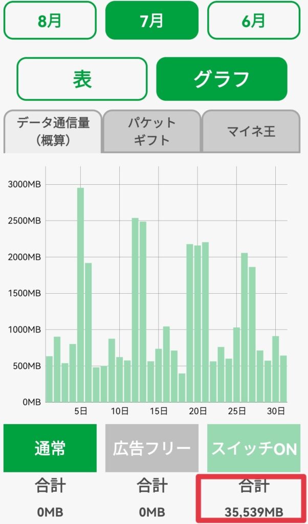6月は56GB、5月は44GB、4月は44GB、3月は49GB、2月は47GB、1月は57GB。全然使わなかったね?