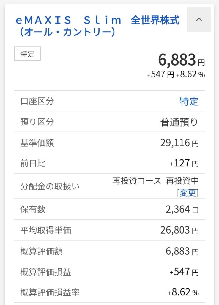 一方、同額を投資信託「eMAXIS Slim 全世界株式(オール・カントリー)」の購入に充てた場合の結果は、このようになりました。