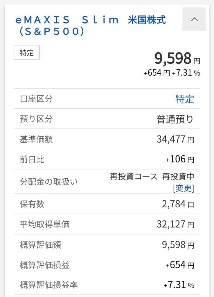 結構大きな差になってきましたが、これはS&P500の成績によるものではありません。含み益は、わずか654円です。大部分は、カブアンドより割安なサービスを利用した事による差です。