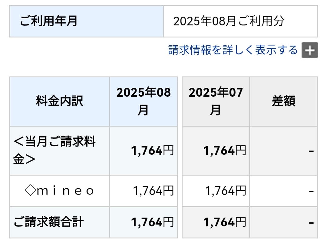 8月は音声通話もSMSも使用ませんでした。というわけで通信料金は、mineoの基本料金のみ1,764円でした。