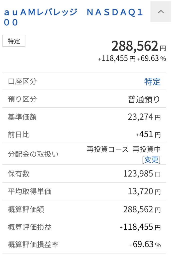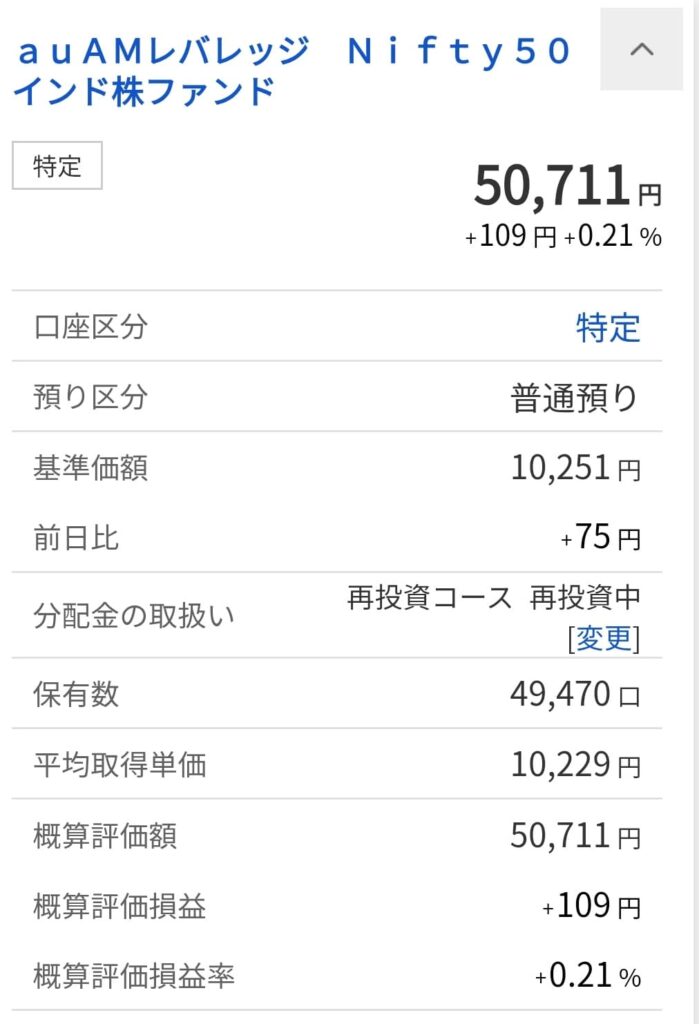投資については、マネックス証券で「auAMレバレッジNASDAQ100」とNifty50(インド株)連動の「eMAXIS インド株インデックス」、2倍レバレッジの「auAMレバレッジnifty50インド株ファンド」を毎日200円ずつ、つみたて設定しています。毎日600円ですね。