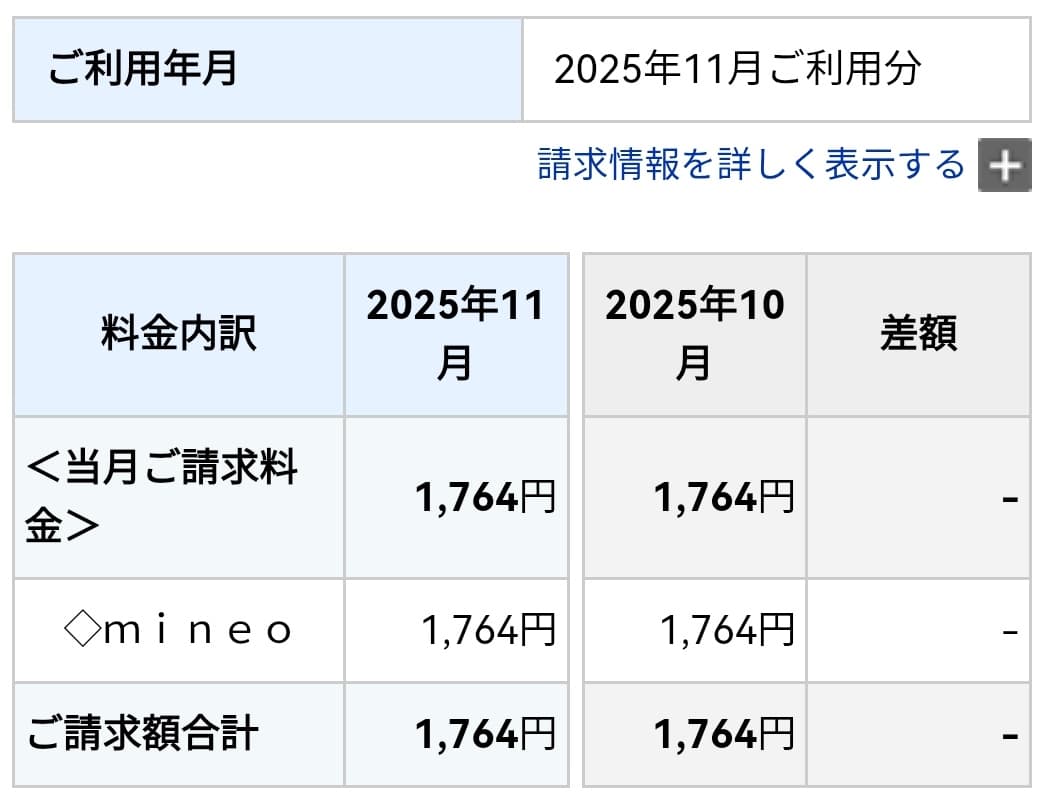 11月も音声通話もSMSも使用ませんでした。というわけで通信料金は、mineoの基本料金のみ1,764円でした。