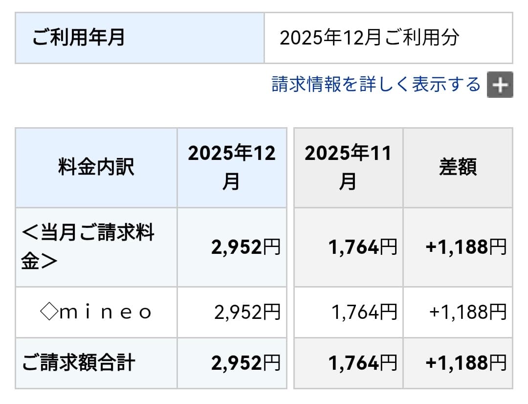 2025年11月までは、キャンペーンで1,188円引きなので1,760円で利用できていましたが、キャンペーン終了に伴い、12月からは2,948円+ユニバーサルサービス料金になります。