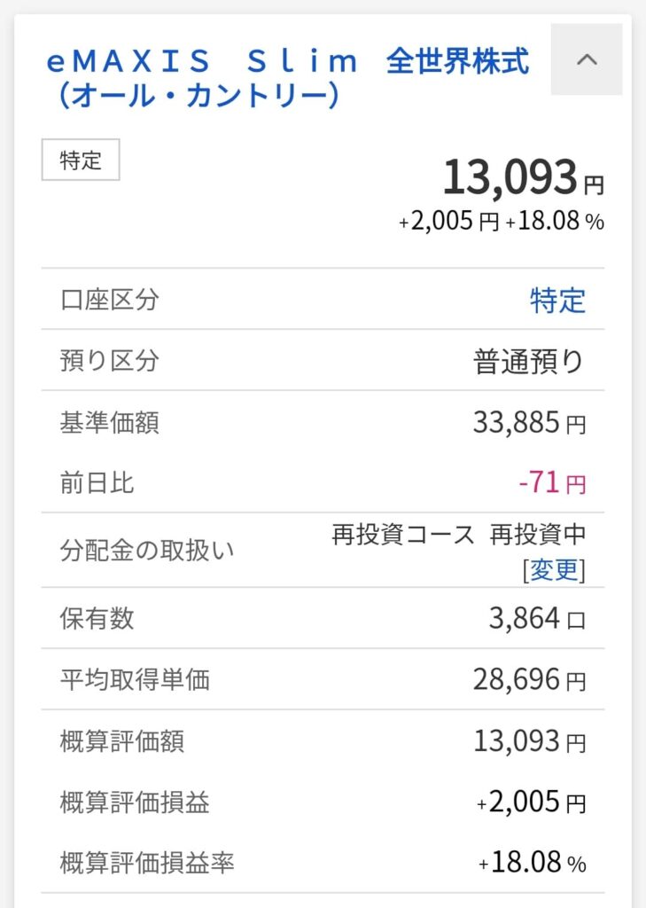 一方、同額を投資信託「eMAXIS Slim 全世界株式(オール・カントリー)」の購入に充てた場合の結果は、このようになりました。
