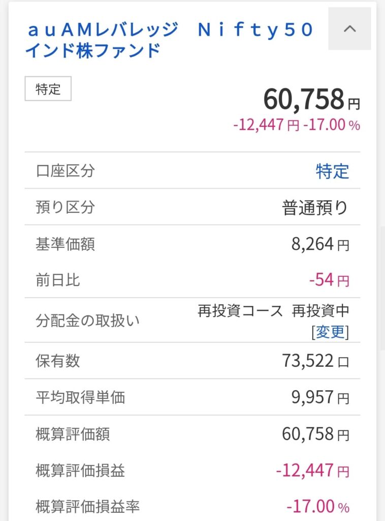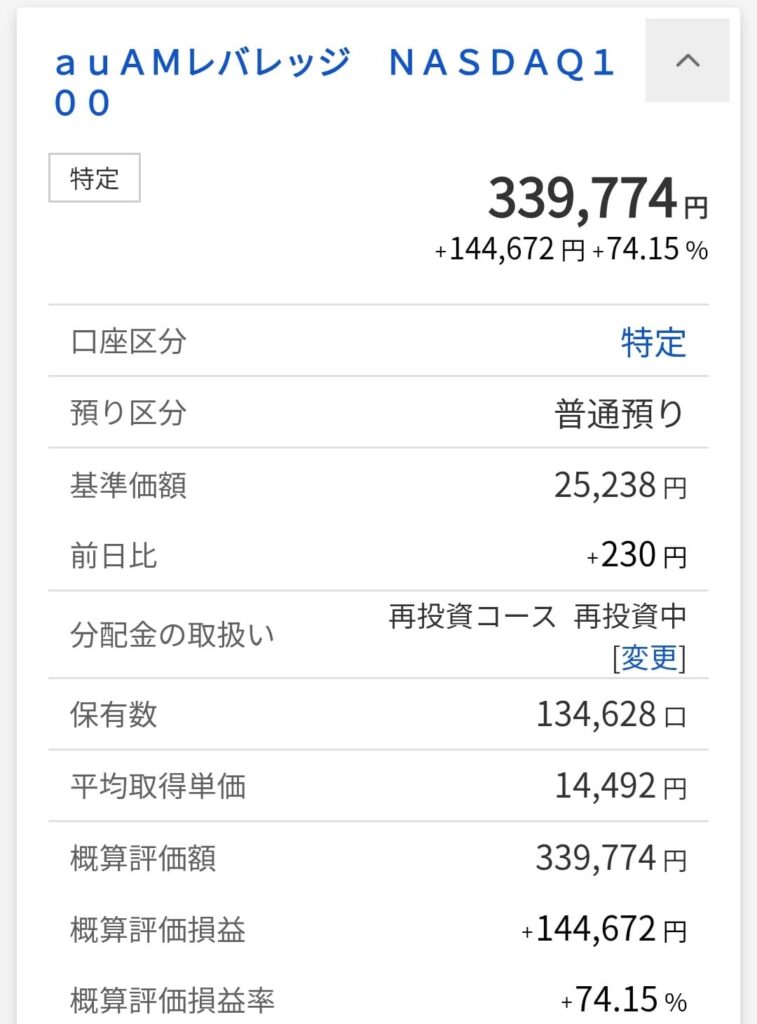 投資については、マネックス証券で「auAMレバレッジNASDAQ100」とNifty50(インド株)連動の「eMAXIS インド株インデックス」、2倍レバレッジの「auAMレバレッジnifty50インド株ファンド」を毎日200円ずつ、つみたて設定しています。毎日600円ですね。
