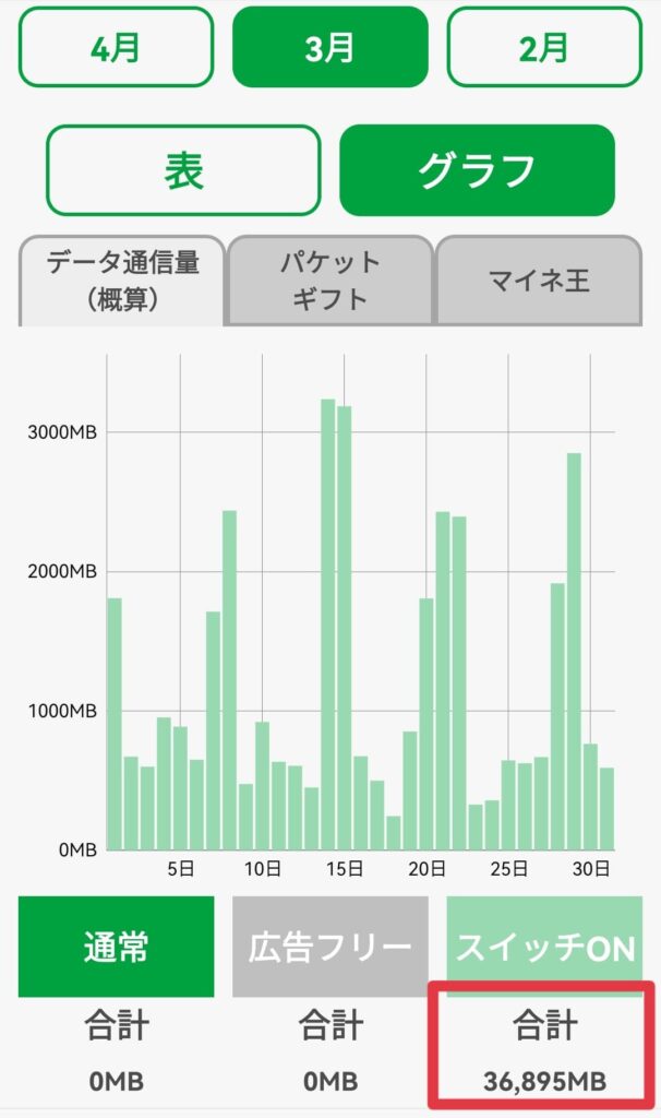 3月は引き継ぎとかで仕事が忙しくてあまり使えなかったからね。40GB超えればお得感が増すんだけどね。
