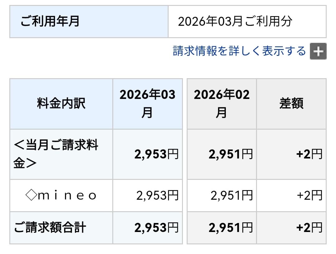 3月も音声通話もSMSも使用ませんでした。というわけで通信料金は、mineoの基本料金のみ2,953円でした。